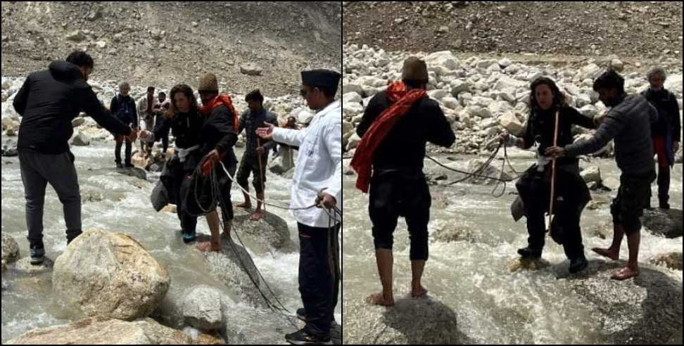 उत्तरकाशी: जनपद उत्तरकाशी के गोमुख दर्शन के लिए ट्रैकर और पर्यटक भागीरथी नदी के बीच जोखिम उठाकर यात्रा कर रहे हैं। इस स्थान पर पुलिया का निर्माण ना होने कारण वहां तैनात स्वास्थ्य मित्र रस्सियों की मदद से पर्यटकों को नदी पार करवा रहे हैं।