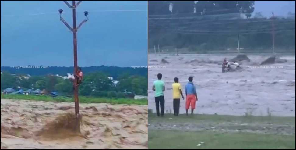 भारी बारिश के बाद आ रहे पानी के सैलाब में लोग देहरादून के प्रेम नगर में बमुश्किल अपनी जान बचते दिखे। सोशल मीडिया पर वायरल हो रहे वीडियो में एक व्यक्ति उफनती टोंस नदी के बीचों-बीच एक खंभे पर चढ़कर अपनी जान बचाता दिखा। रिपोर्ट्स के मुताबिक देहरादून के प्रेम नगर क्षेत्र में उत्तराँचल यूनिवर्सिटी का पुल बह गया है, टोंस नदी मैं उफान पर पानी आने के बाद कई लोग पानी के बीच फंस गए। कुछ लोग काफी दूर तक पानी में बहते चले गए। प्रेम नगर क्षेत्र में सड़कों और पुलों को भी भारी मात्रा में नुकसान पहुंचा है।