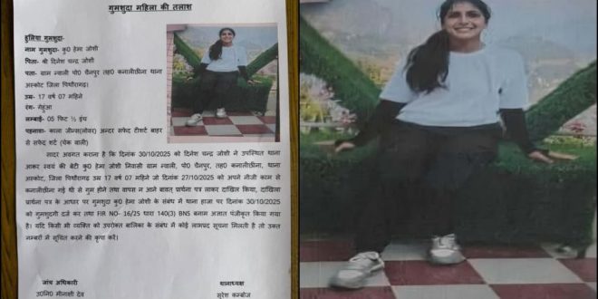 जानकारी के अनुसार, पिथौरागढ़ जिले में तहसील कनालीछीना के अंतर्गत स्थित ग्राम न्वाली, पोस्ट चैनपुर के निवासी दिनेश चंद्र जोशी ने बीते 30 अक्टूबर को अस्कोट थाने में अपनी 17 वर्षीय बेटी हेमा जोशी की गुमशुदगी की शिकायत दर्ज कराई। उन्होंने पुलिस दी गई तहरीर में बताया कि उनकी बेटी बीते 27 अक्टूबर 2025 को किसी निजी कार्य से कनालीछीना बाजार गई थी। लेकिन उसके बाद से वह घर नहीं लौटी है। परिजनों ने पहले रिश्तेदारों और परिचितों और आसपास के क्षेत्रों में उनकी खोज की, लेकिन कहीं से भी हेमा की कोई जानकारी नहीं मिल पाई। पीड़ित पिता दिनेश जोशी द्वारा दी गई तहरीर के आधार पर अस्कोट थाना पुलिस ने गुमशुदगी की रिपोर्ट दर्ज कर, उसकी तलाश शुरू कर दी।