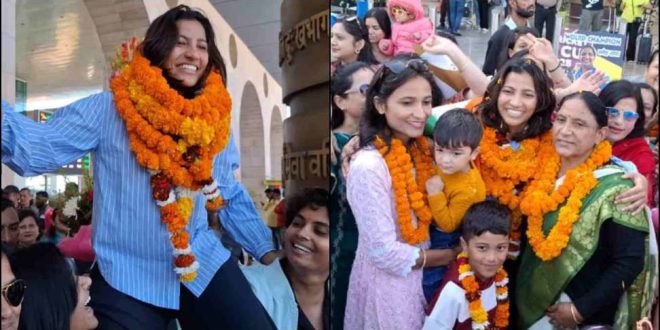 देहरादून: महिला क्रिकेट विश्व कप में ऐतिहासिक जीत दर्ज करने के बाद भारतीय टीम की ऑलराउंडर स्नेह राणा शुक्रवार को पहली बार अपने गृहनगर देहरादून पहुंचीं। जैसे ही स्नेह राणा का विमान जॉलीग्रांट एयरपोर्ट पर उतरा, वहां मौजूद लोगों ने ढोल-नगाड़ों और फूलों की मालाओं के साथ उनका भव्य स्वागत किया।