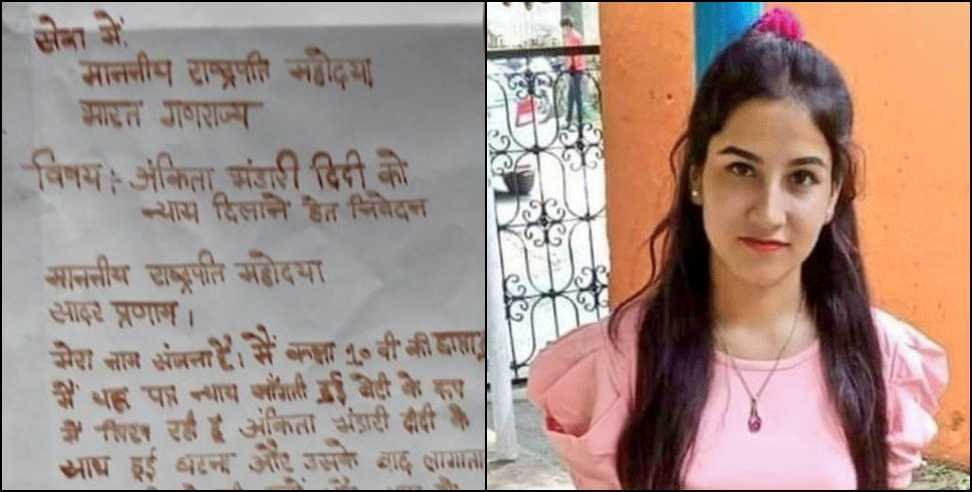 संजना बौड़ाई द्वारा भारत के राष्ट्रपति को संबोधित इस पत्र में अंकिता भंडारी को न्याय दिलाने के साथ-साथ मामले में कथित रूप से शामिल प्रभावशाली (वीआईपी) लोगों की शीघ्र गिरफ्तारी की मांग की गई है। छात्रा ने लिखा है कि भारत एक न्यायप्रिय देश है, जहां कानून से ऊपर कोई नहीं होना चाहिए। पत्र में कहा गया है कि अंकिता भंडारी जैसी बेटियों के साथ होने वाली घटनाएं पूरे समाज को झकझोर देती हैं। यदि ऐसे मामलों में प्रभावशाली लोगों को संरक्षण मिलता है, तो आम नागरिकों का न्याय व्यवस्था से विश्वास डगमगा जाता है। संजना ने राष्ट्रपति से आग्रह किया है कि वे इस गंभीर मामले में हस्तक्षेप कर दोषियों के खिलाफ सख्त कार्रवाई सुनिश्चित करें, ताकि भविष्य में कोई भी बेटी खुद को असुरक्षित महसूस न करे।पत्र में यह भी उल्लेख किया गया है कि देश की बेटियों की सुरक्षा केवल सरकार ही नहीं, बल्कि प्रत्येक नागरिक की सर्वोच्च जिम्मेदारी है। संजना ने भावुक शब्दों में लिखा कि वह एक साधारण छात्रा है, लेकिन एक जिम्मेदार नागरिक होने के नाते अन्याय के खिलाफ आवाज उठाना अपना कर्तव्य मानती है।